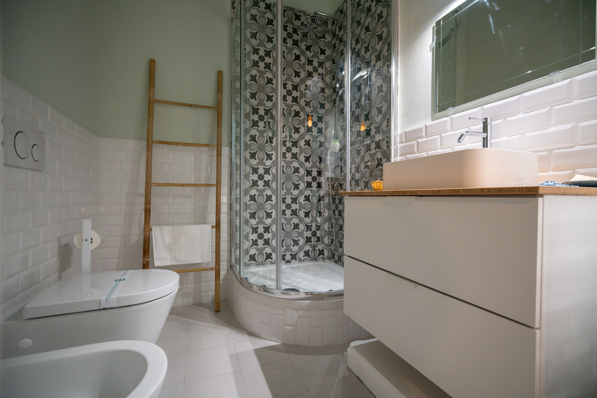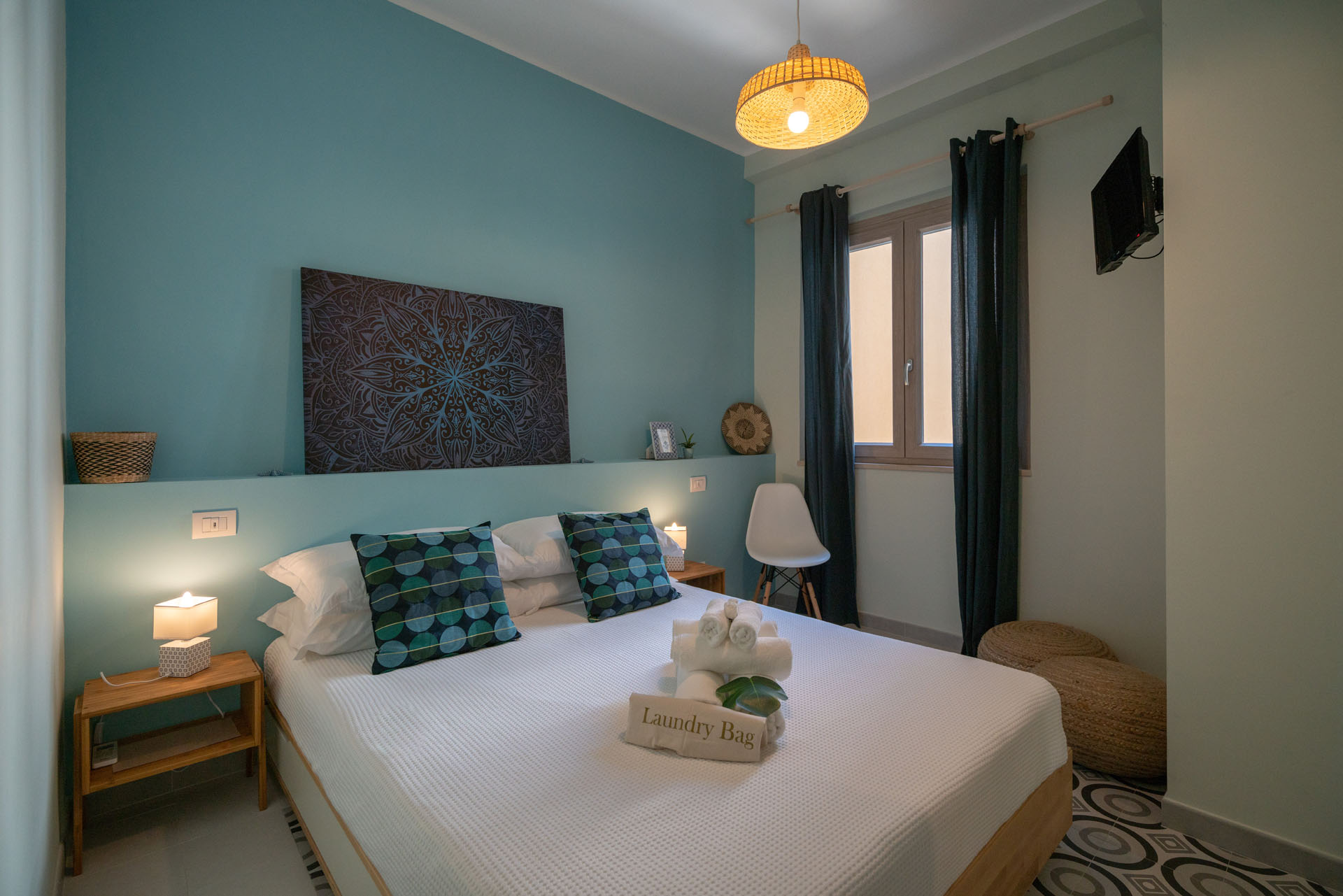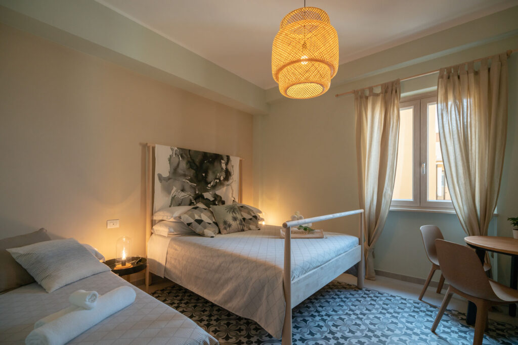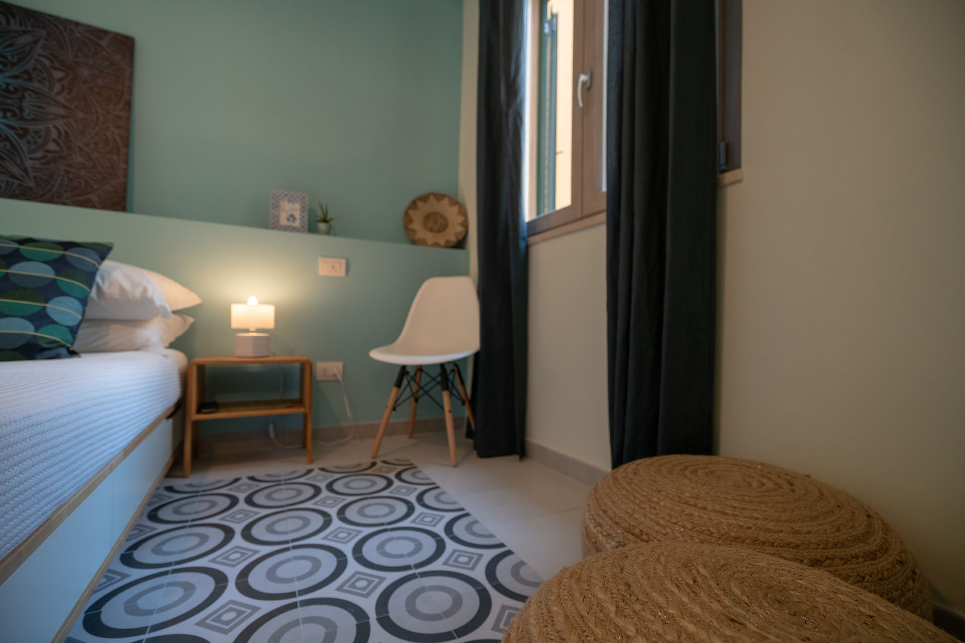 Stanza matrimoniale standard con bagno privato composta da letto matrimoniale con doghe in legno massello. Sedia di design e due poufs in juta. Lampadario in bambù intrecciato.